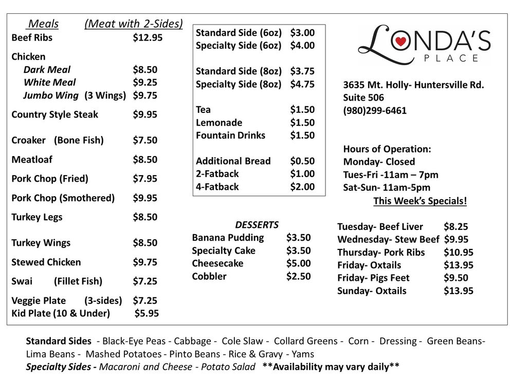 Londa's Place is a Southern soul food restaurant located in Charlotte, NC. Known for its warm hospitality and delicious home-cooked meals, it offers a menu full of traditional favorites like oxtail, mac & cheese, candied yams, and jalapeƱo cheddar cornbread. Customers rave about the flavorful dishes and friendly service, making it a go-to spot for families and friends alike. With options for vegetarians and a variety of desserts, Londa's Place caters to a wide range of tastes. The restaurant also offers happy hour specials, outdoor seating, and accepts cryptocurrency, making it a modern and welcoming dining destination. Don't miss out on experiencing the true taste of Southern comfort food at Londa's Place.